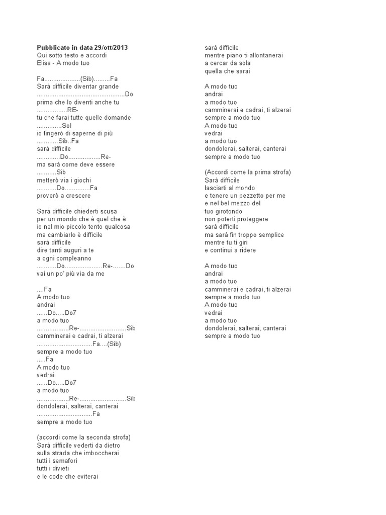 A Modo Mio Elisa : Pin Su Citazioni - Sarà difficile vederti da dietro sulla strada che imboccherai tutti i semafori tutti i divieti e le code che eviterai sarà difficile mentre piano ti allontanerai a cercar da sola quella che sarai.. Descrive bene il difficile ruolo del genitore che cresce i propri figli: Il brano è stato scritto da ligabue ispirato dalla figlia linda. Luciano ha voluto però regalarlo ad elisa che l'ha aggiunto nel suo ultimo album l'anima vola. Elisa e negramaro l'immenso una poesia anche per te solo tre minuti eppure sentire. I sogni a modo mio.